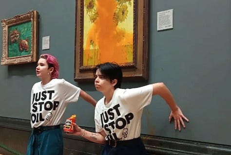 NOT KNOWING ABOUT THE GLASS that covers Van Gogh’s Sunflowers, I remember the visceral shock when I first saw the picture of Anna Holland and fellow Just Stop Oil protester Phoebe Plummer, their left hands glued to the wall of London’s National Gallery as orange Heinz tomato soup dripped down the famous yellow blooms. Holland, a 22-year old poetry student from Newcastle, was the one brandishing an empty can; the second was rolling under the guard rope behind which they – and the soup – were supposed to have remained.
